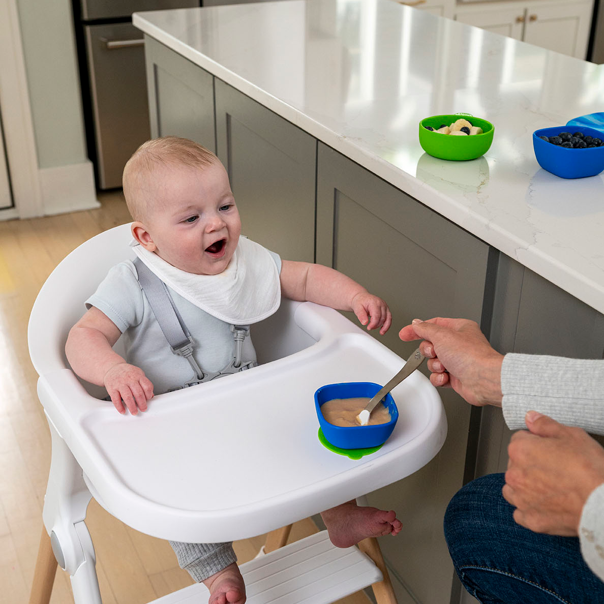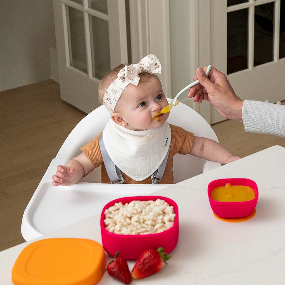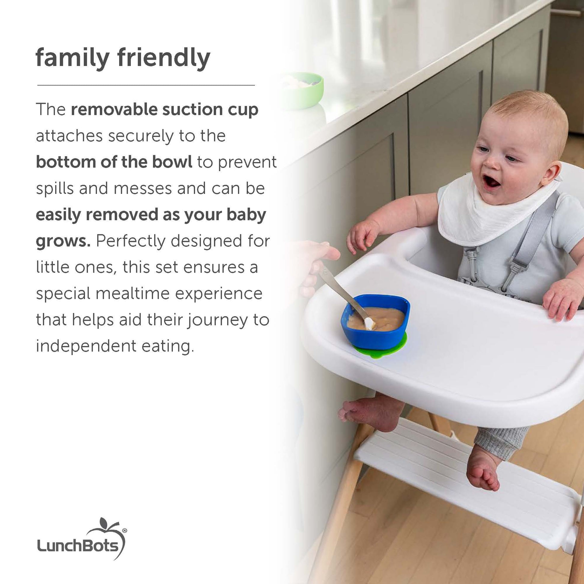 Perfectly designed for little ones, this set ensures a special mealtime experience that helps aid their journey to independent eating. The removable suction cup attaches securely to the bottom of the bowl to prevent spills and messes and can be easily removed as your baby grows.