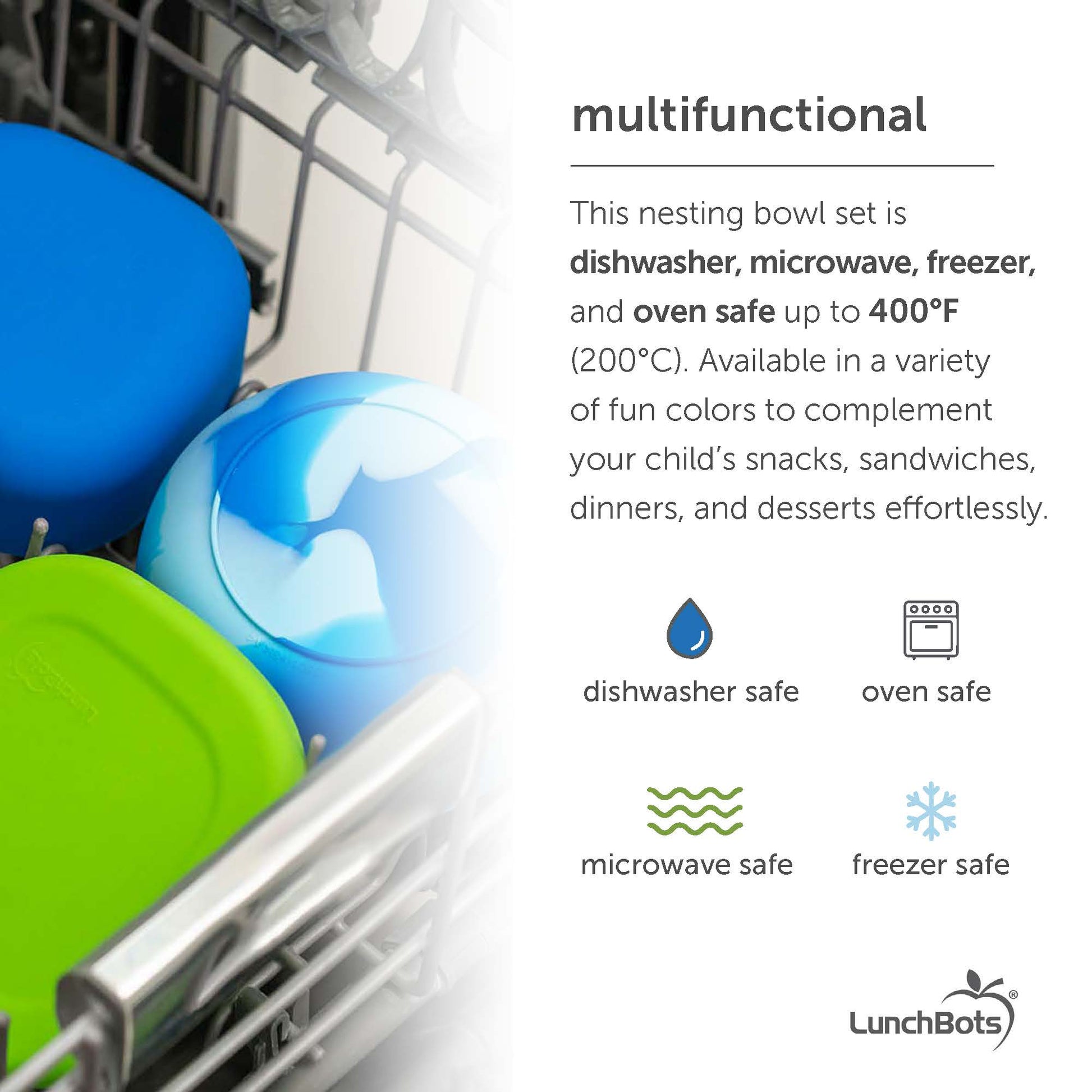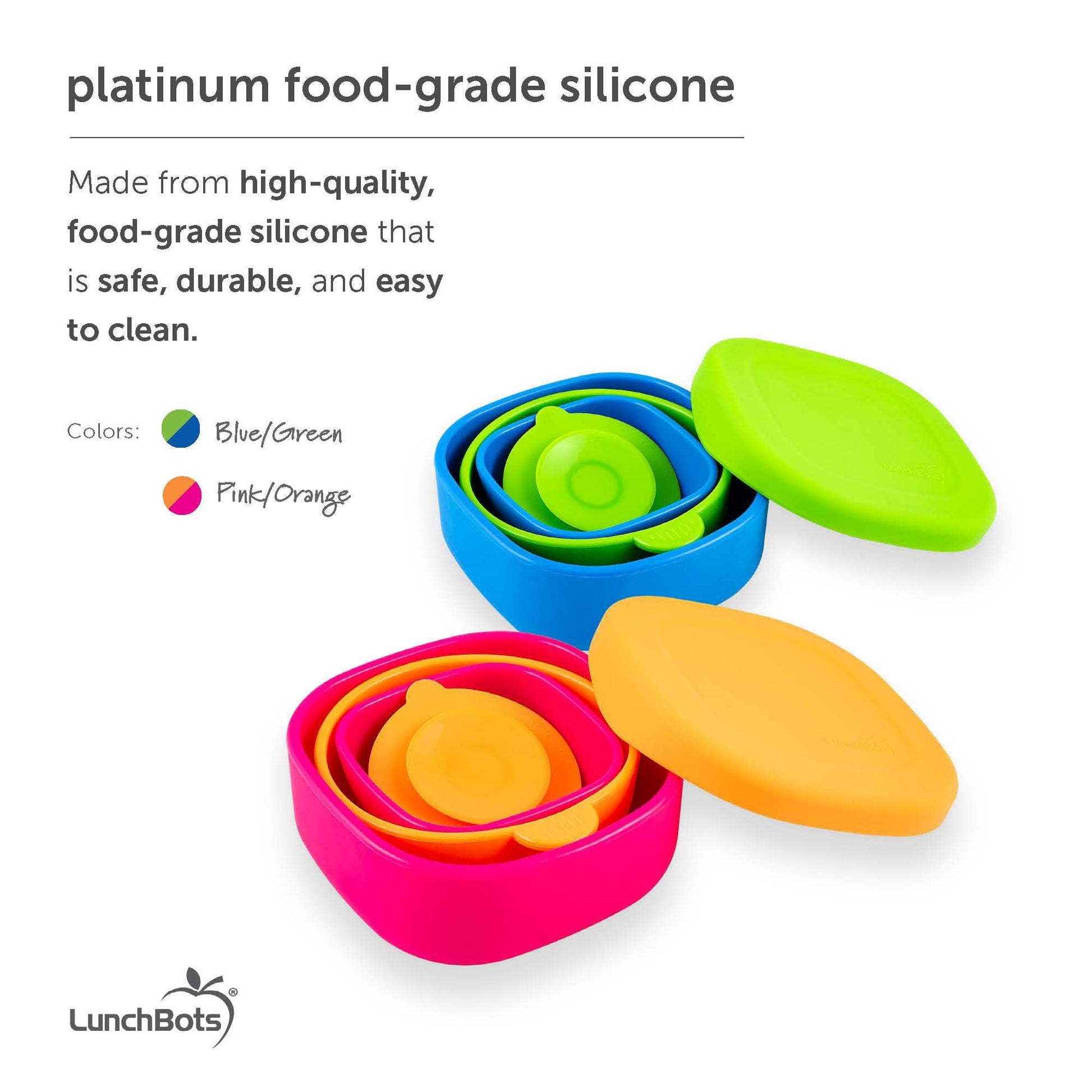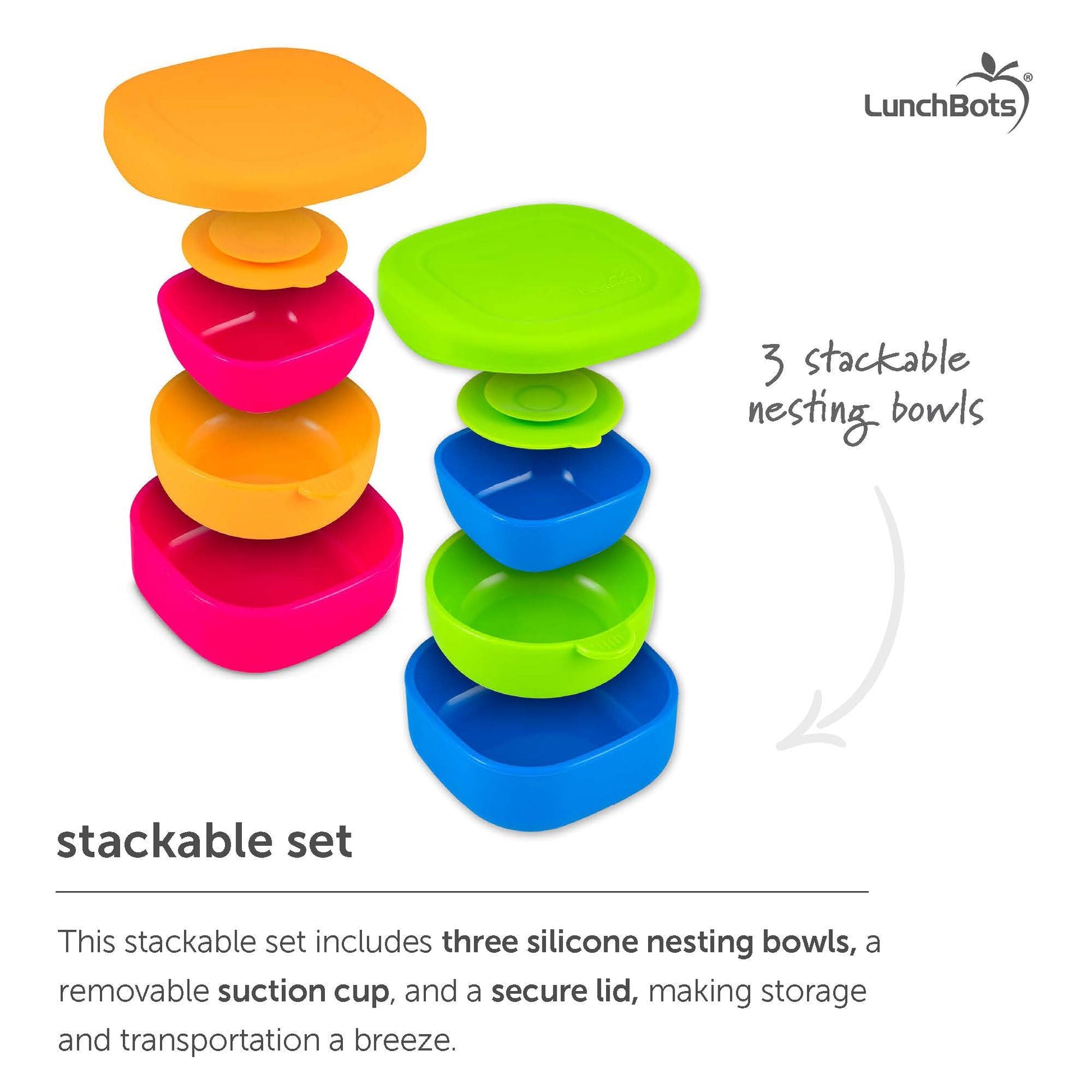 Introducing Bitty Bowls, the ideal mealtime companion for the youngest members of your family! This stackable set includes three silicone nesting bowls, a removable suction cup, and a secure lid, making storage and transportation a breeze.