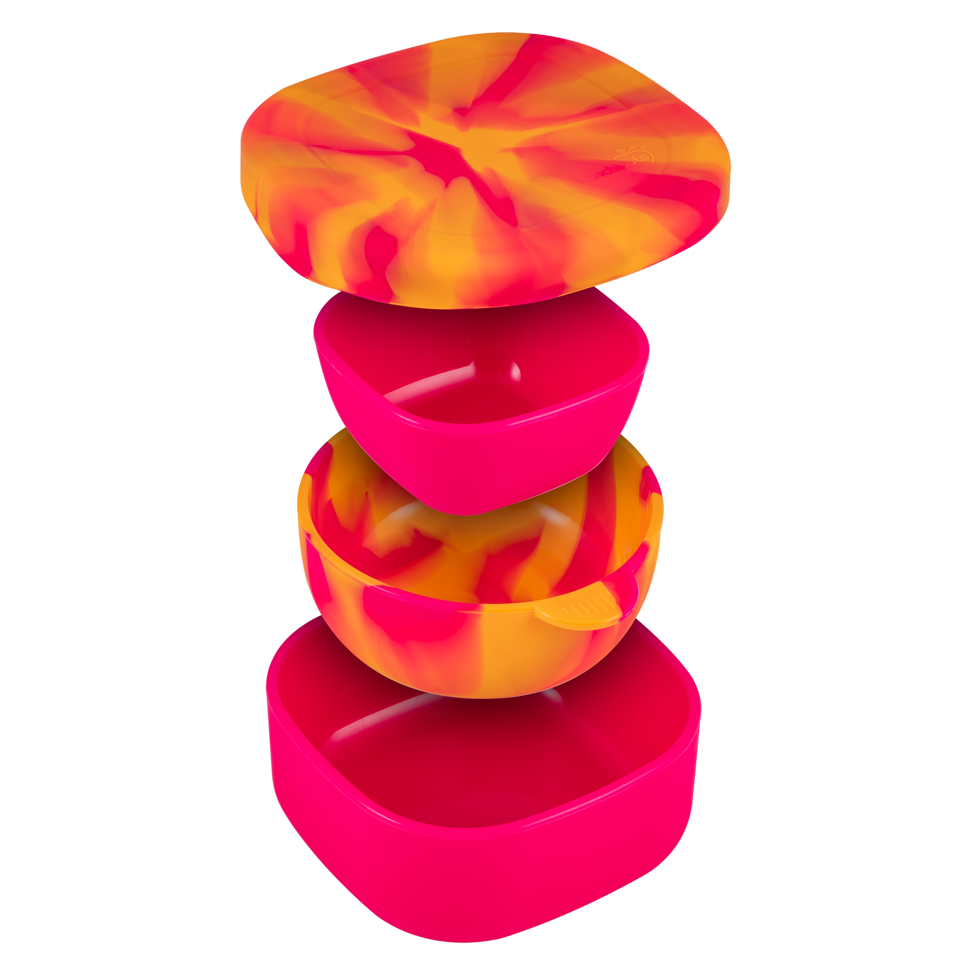 Introducing Mighty Bowls, the versatile and family-friendly addition to your kitchen! This stackable set includes three silicone nested bowls and a secure lid, making storage and transportation a breeze.