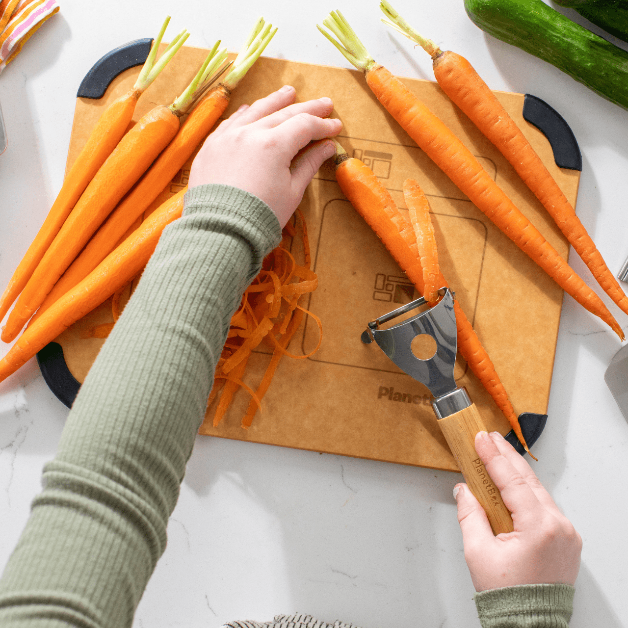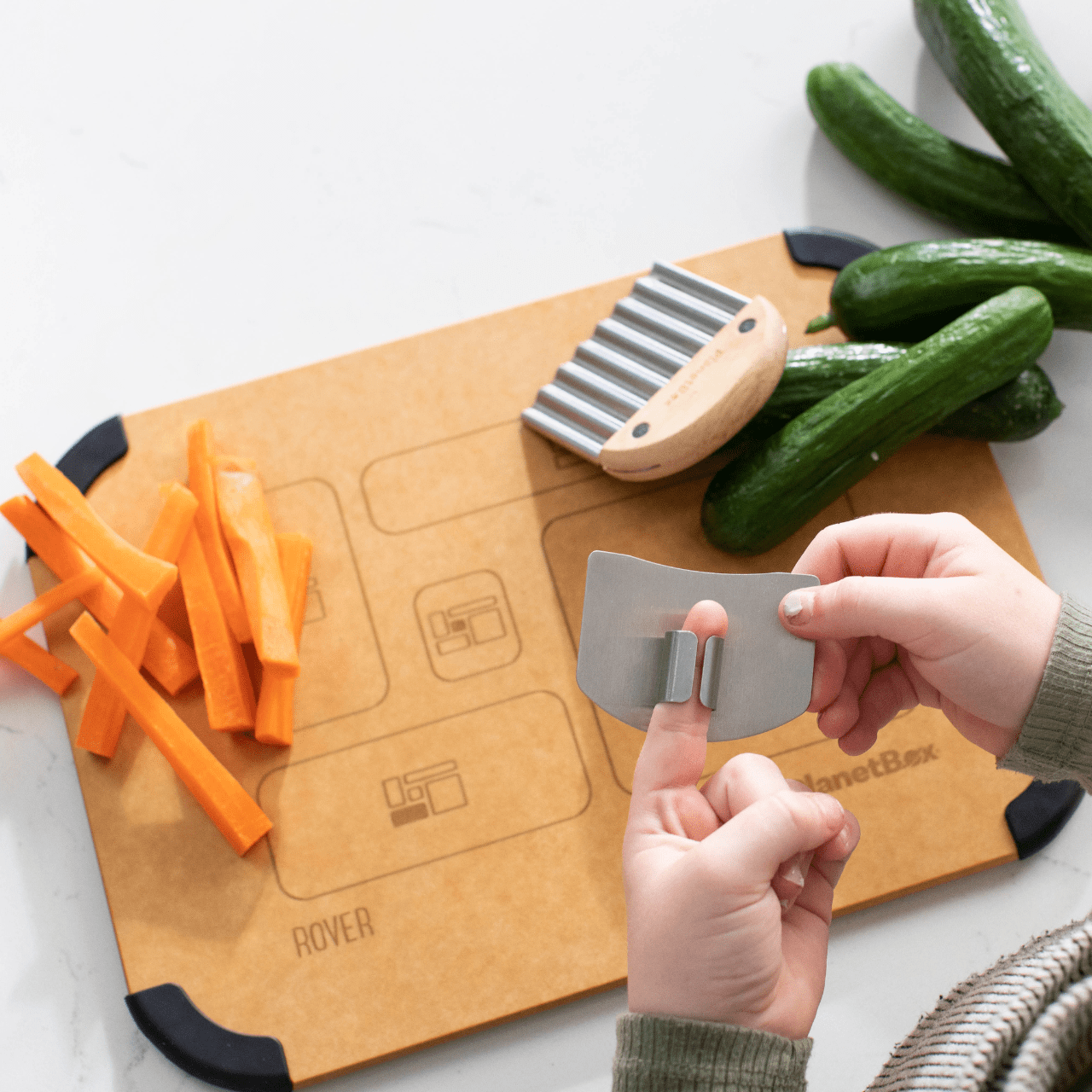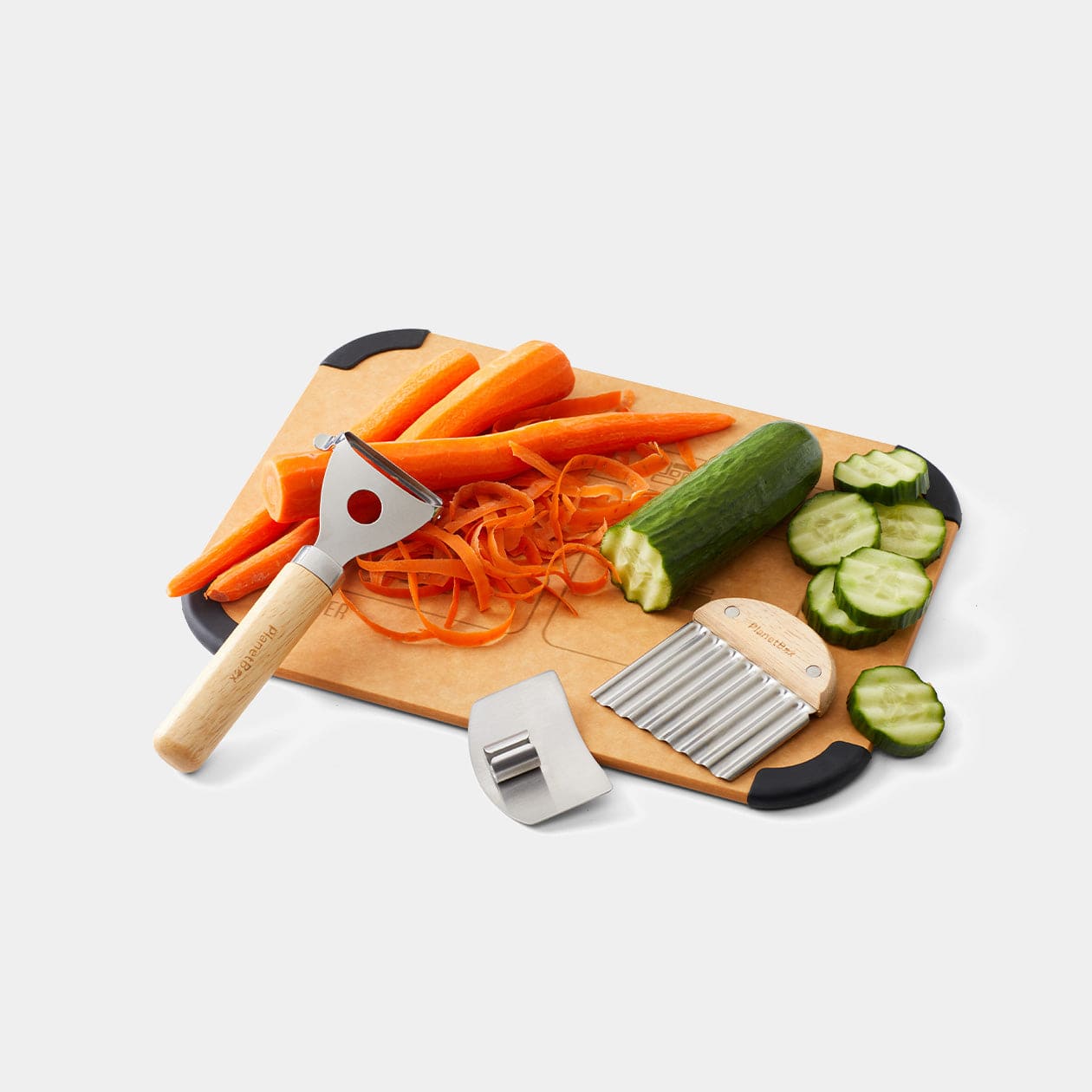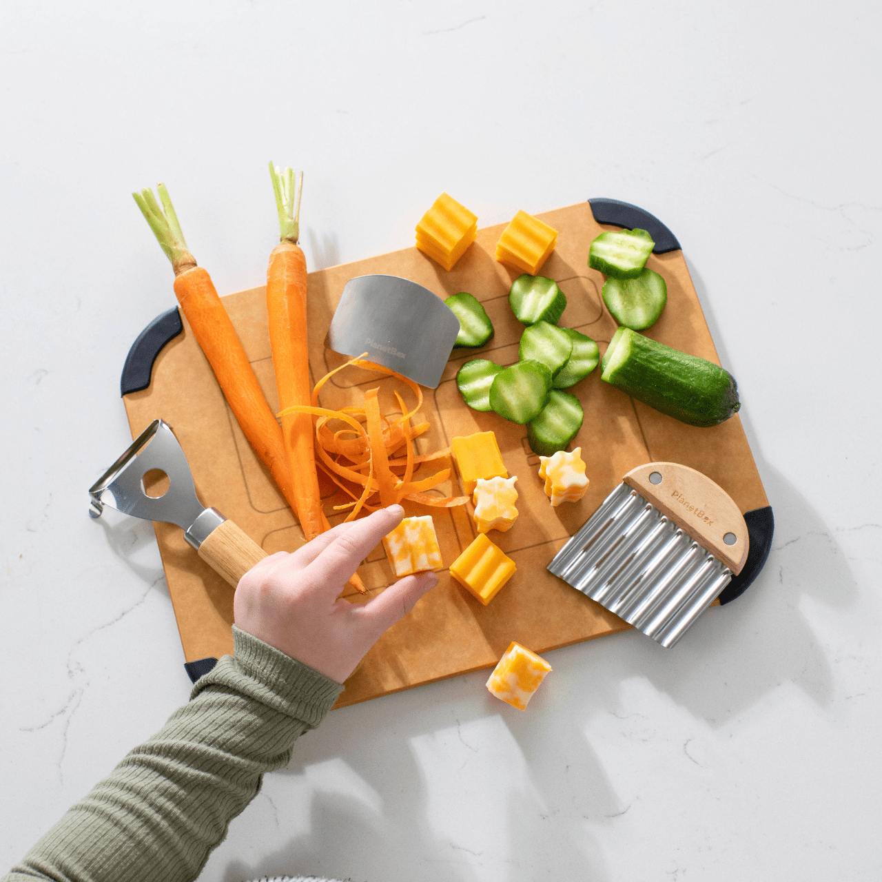 Three piece set encourages independence and lets kids get creative. Including a peeler, wavy chopper, and adjustable finger guard, kids can prepare playful shapes in a cinch.